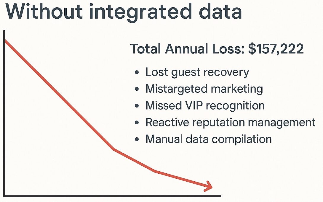 Lost Guest Recovery: Without unified data, you can’t identify guests at risk of churning until they’re already gone. Average cost: $127 per lost guest × 15% annual churn = $87,450 for a 3-location group.