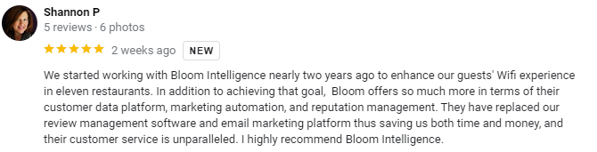 Bloom Intelligence aggregates reviews from Google, Facebook, Yelp, TripAdvisor, Tock, OpenTable, and surveys into one dashboard, giving restaurants a clear, real-time view of guest sentiment and the voice of their guest. These insights power AI-driven marketing and reputation management to act, improve, and measure boosts in guest satisfaction.